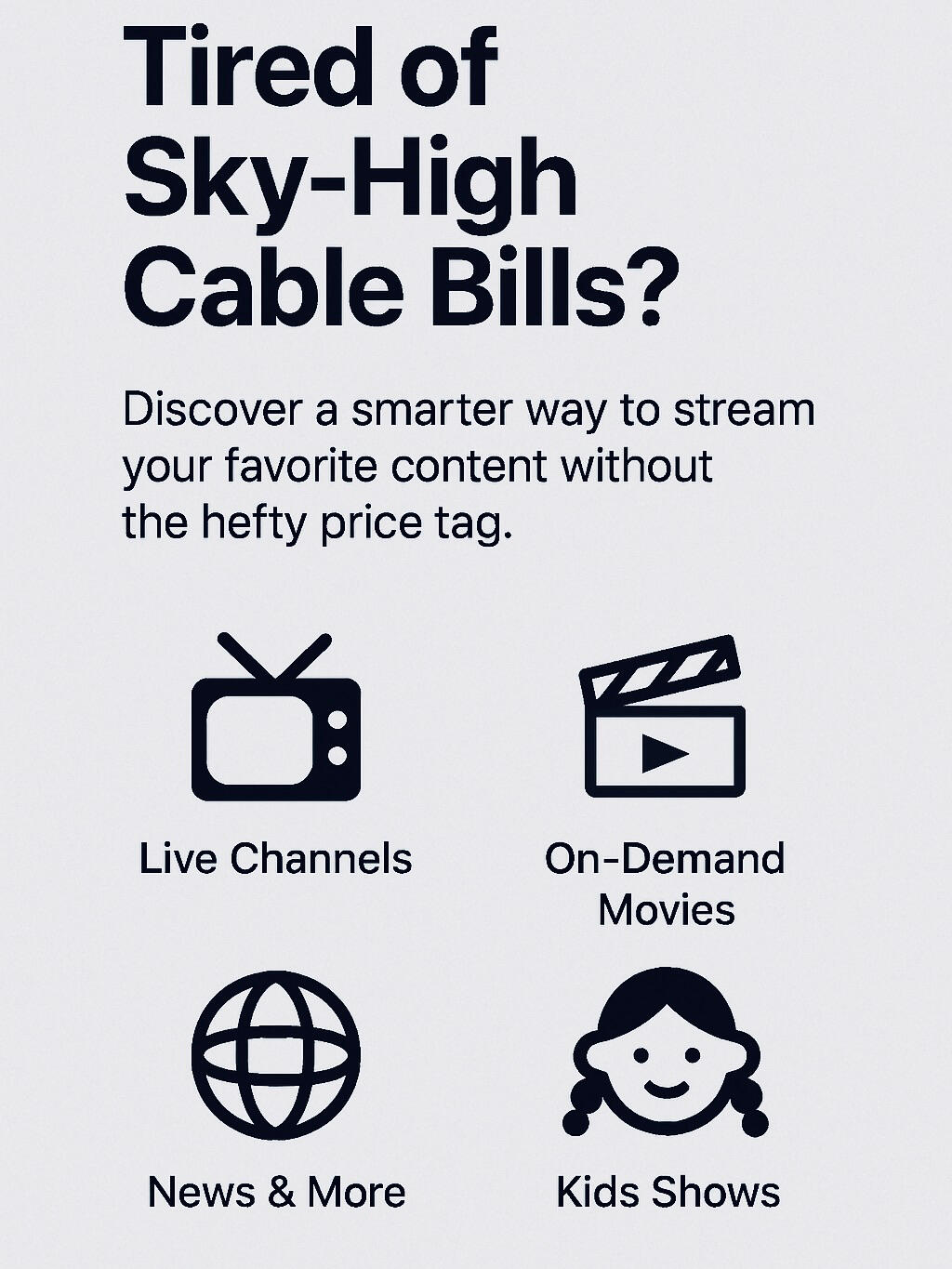 Experience a vast selection of live channels, on-demand movies, and more—all at a fraction of traditional costs. Watch anywhere there's Internet! No added fees. No hidden costs. No contracts. One Low Price! $49/mo (Discount codes will apply)
